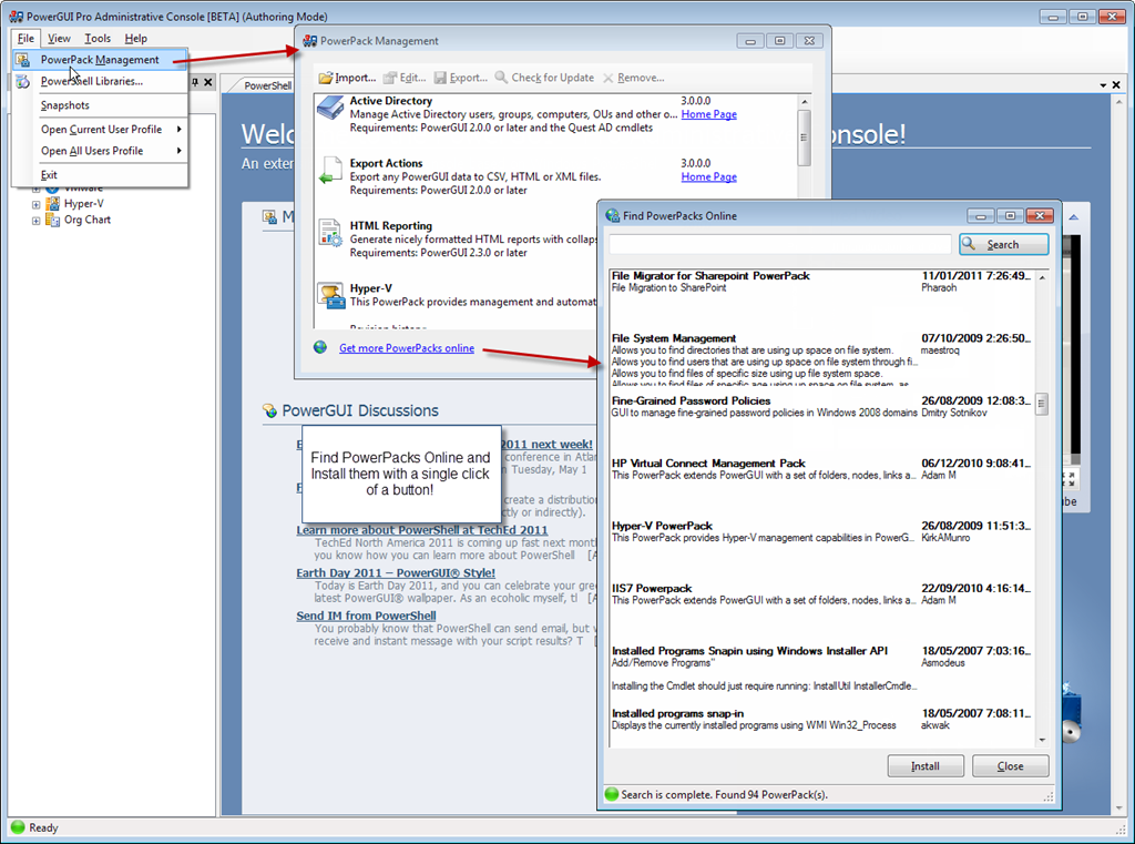 In our previous release we added support for one-click install for Add-ons in the Script Editor, allowing users to search for Add-ons on PowerGUI.org and install them with a single button click (there are some highly recommended Add-ons available by the way, so check them out if you haven’t already). Now we’re providing the same support for PowerPacks, so you can search online for PowerPacks, select the ones you like from the list of results, and click on a button to download, unblock, install and load those PowerPacks in the Admin Console. We have a large library of PowerPacks available, which you can see by clicking on the Show All button in the Find PowerPacks Online dialog. I strongly recommend you give them a look, because there is a ton of useful PowerShell functionality in those PowerPacks.