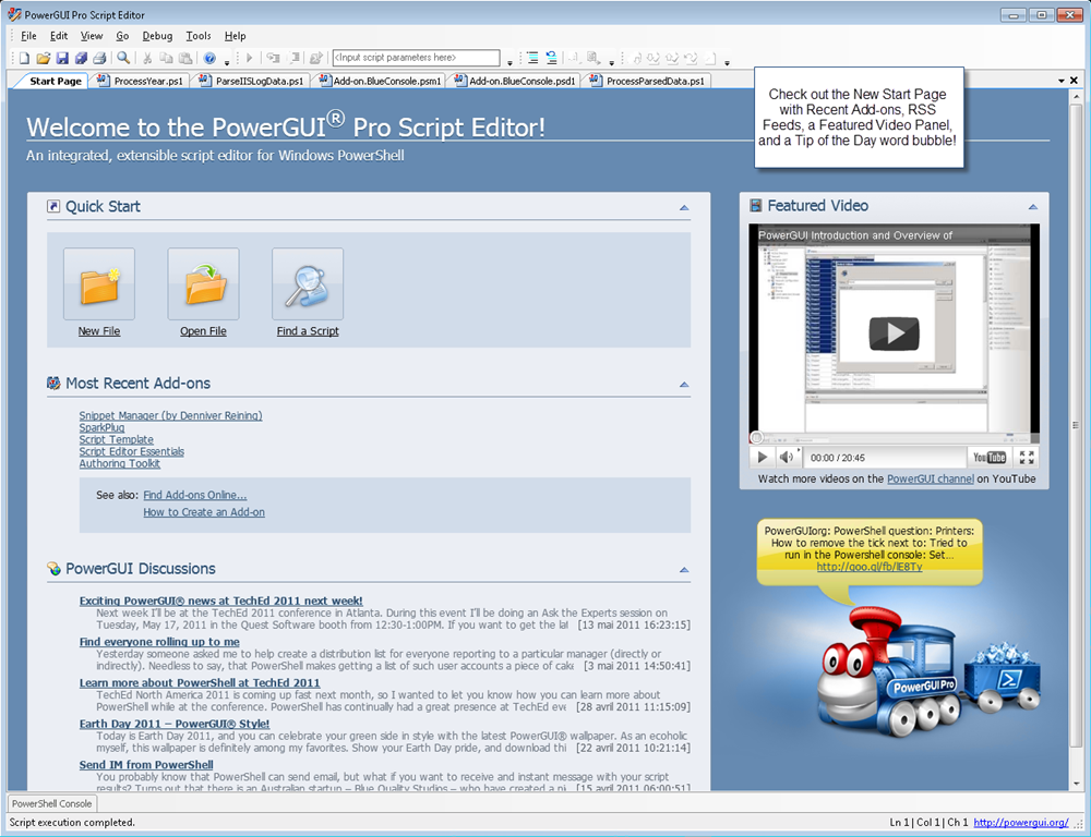 While the PowerGUI Script Editor is closed, double-clicking on a ps1, psm1 or psd1 file or right-clicking on one of those file types and selecting “Open with PowerGUI Script Editor” will open the file you selected in the Script Editor as expected; however the Start Page will appear as the active tab in the Script Editor instead of the file you opened.