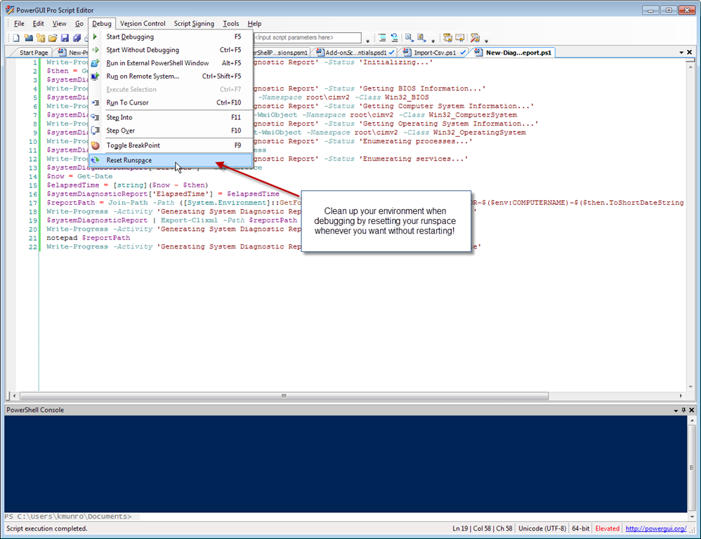 Also, regarding feedback, I would be remiss if I didn’t mention one last feature that we’ve added to this release.  This release introduces anonymous data collection to PowerGUI.  It was important for us to add this for the reasons I just highlighted in the last paragraph – your feedback is that important, and we can learn a lot about where we need to spend our effort by reviewing usage data.  The data gathered does not contain any personal information, nor does it contain any scripts you write or anything like that.  It’s simply data about how you are using the product.  Please opt-in for this usage data collection so that we can make the product even better going forward.  You can always opt out, but feedback is important, so we’d really appreciate it if you would opt-in.