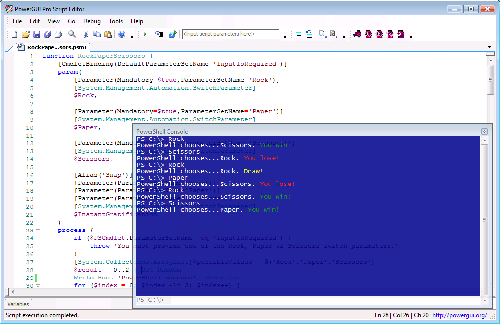 Creating a proxy function is easy. All you have to do is follow a few steps to get the command you need to run that generates the proxy function body, and then work within your favorite editor to copy that command body into your function in the file you are working on. My favorite editor is PowerGUI, so I’ll use that in my example. First, make sure you have installed PowerGUI with the new PowerShell 2.0 snippets (you can read more about those here) and then open up your PowerGUI Script Editor and follow these steps: