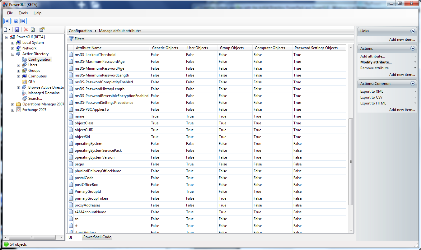 There are In the PowerGUI Admin Console, expand the “Active Directory” node and click on “Configuration”.  This will show you the current domain that PowerGUI will gather data from.  You can change this if you like, however you don’t need to unless you want to use alternate credentials or connect to another domain.  With the configuration showing in the grid, click on the “Manage default attributes” link.  That will present you with a view something like this: