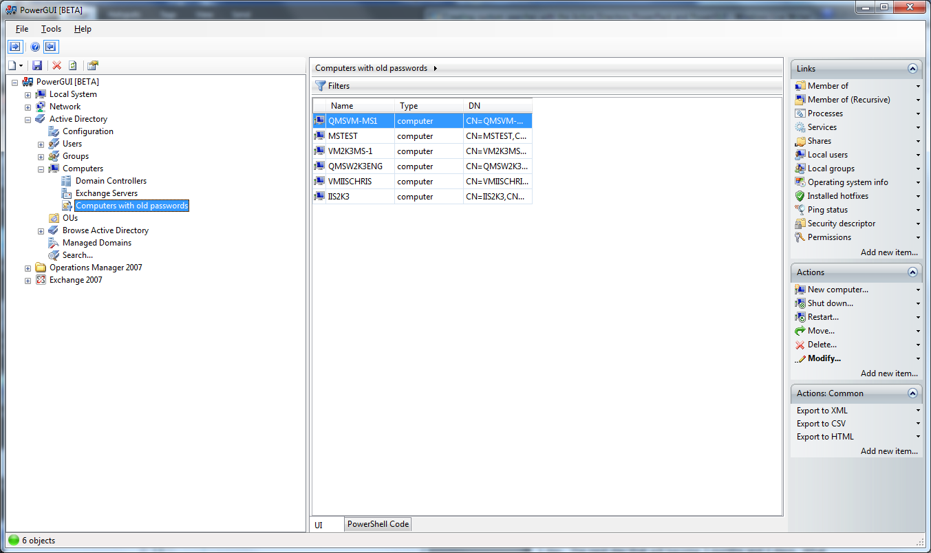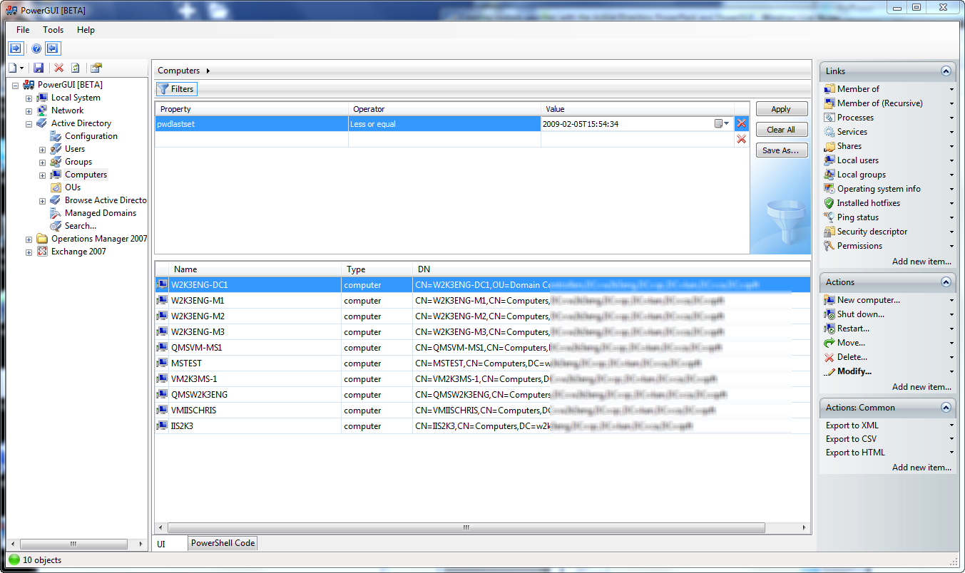 Now that you have the data you’re looking after, your “Computers” node is now configured to always show you the filtered list because PowerGUI remembers the filters you apply to nodes.  You might not like this configuration, preferring to have a separate node to view the data that you want.  Fortunately, PowerGUI lets you do create that easily too, and you still don’t have to do any scripting.  To create a separate node that lets you get the same data set, simply click on the “Save As…” button in the filter panel.  This will allow you to save the script from the Computers node with the filter you have created automatically applied as a client-side filter for that script.  Simply give the new script node a name (something intuitive like “Computers with old passwords” will do), and click on OK to save the new child node.  Then you can click on the “Clear All” button in the filter panel for your “Computers” node because that filter will no longer be needed.  Now click on your new node and you’ll get the list of computers you are after, and it will look something like the screenshot below.